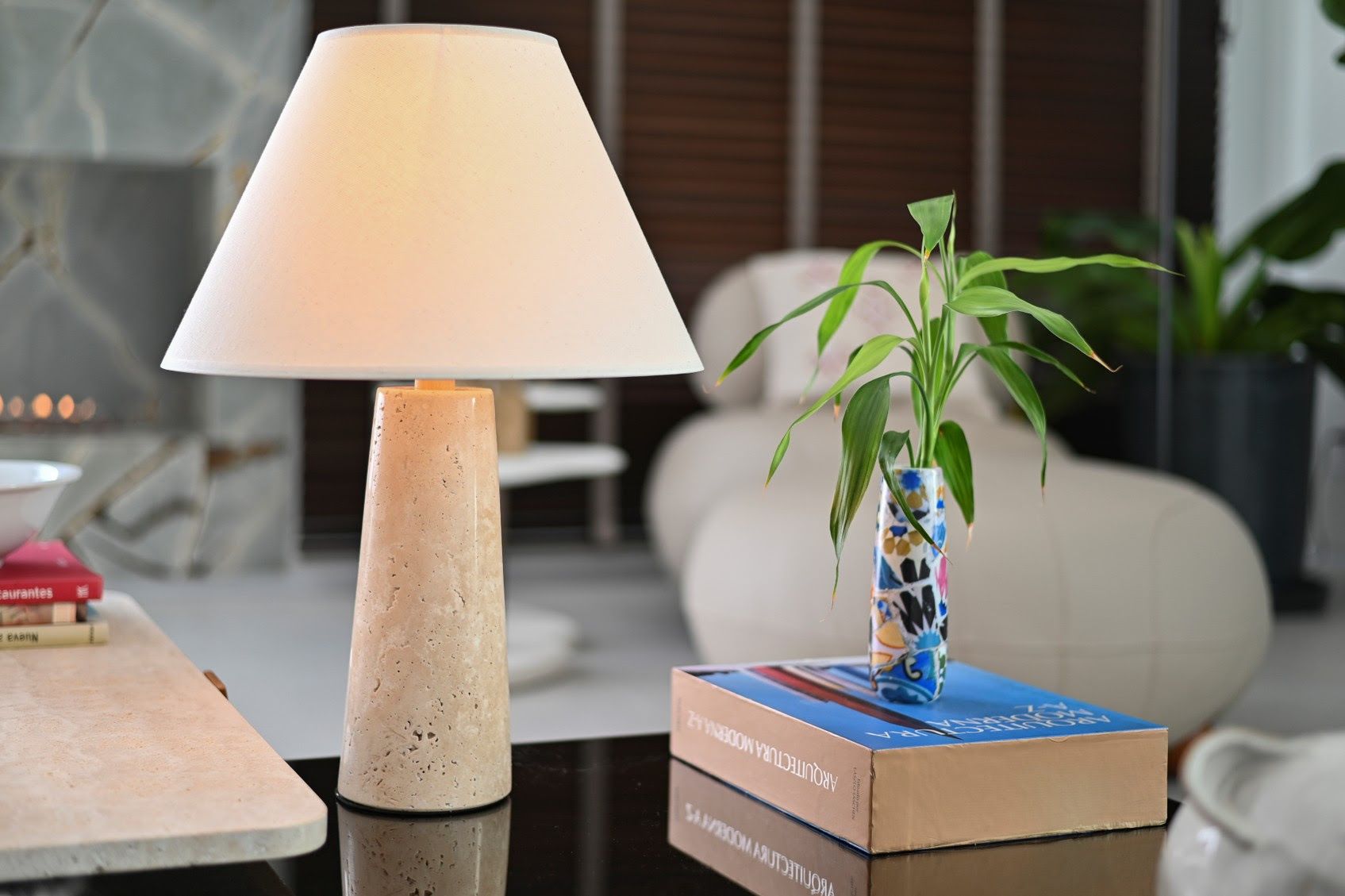 Abajur com cúpula de tecido e base em pedra travertino, disponível na Yamamura, em projeto do arquiteto Giancarlo Filgueiras | Foto de Emerson Rodrigues